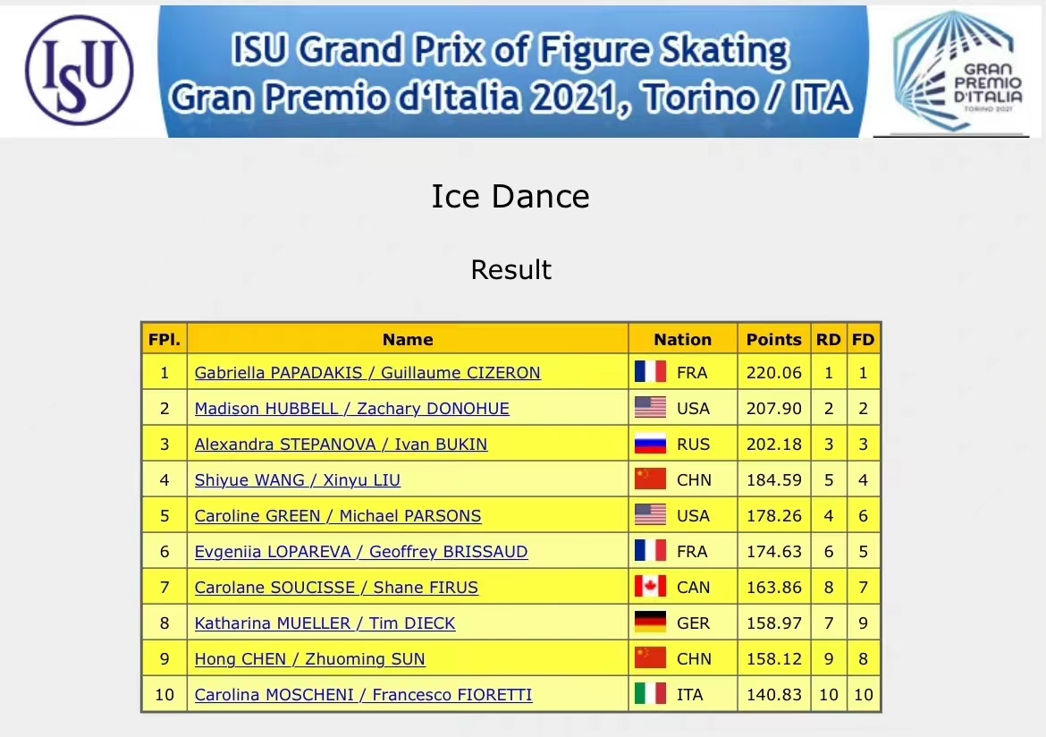 国际滑联花样滑冰大奖赛意大利站比赛冰舞项目可谓高手云集。在北京时间11月7日凌晨结束的冰舞自由舞的比赛中,此前因新冠疫情而缺席赛场两年的法国名将帕帕达基斯/西泽龙依然实力出众,作为四届世锦赛冠军、平昌冬奥会银牌得主,他们在本场比赛中以绝对优势夺得冠军,美国组合胡贝尔/多诺胡和俄罗斯组合斯泰潘诺娃/布金分列二三位。