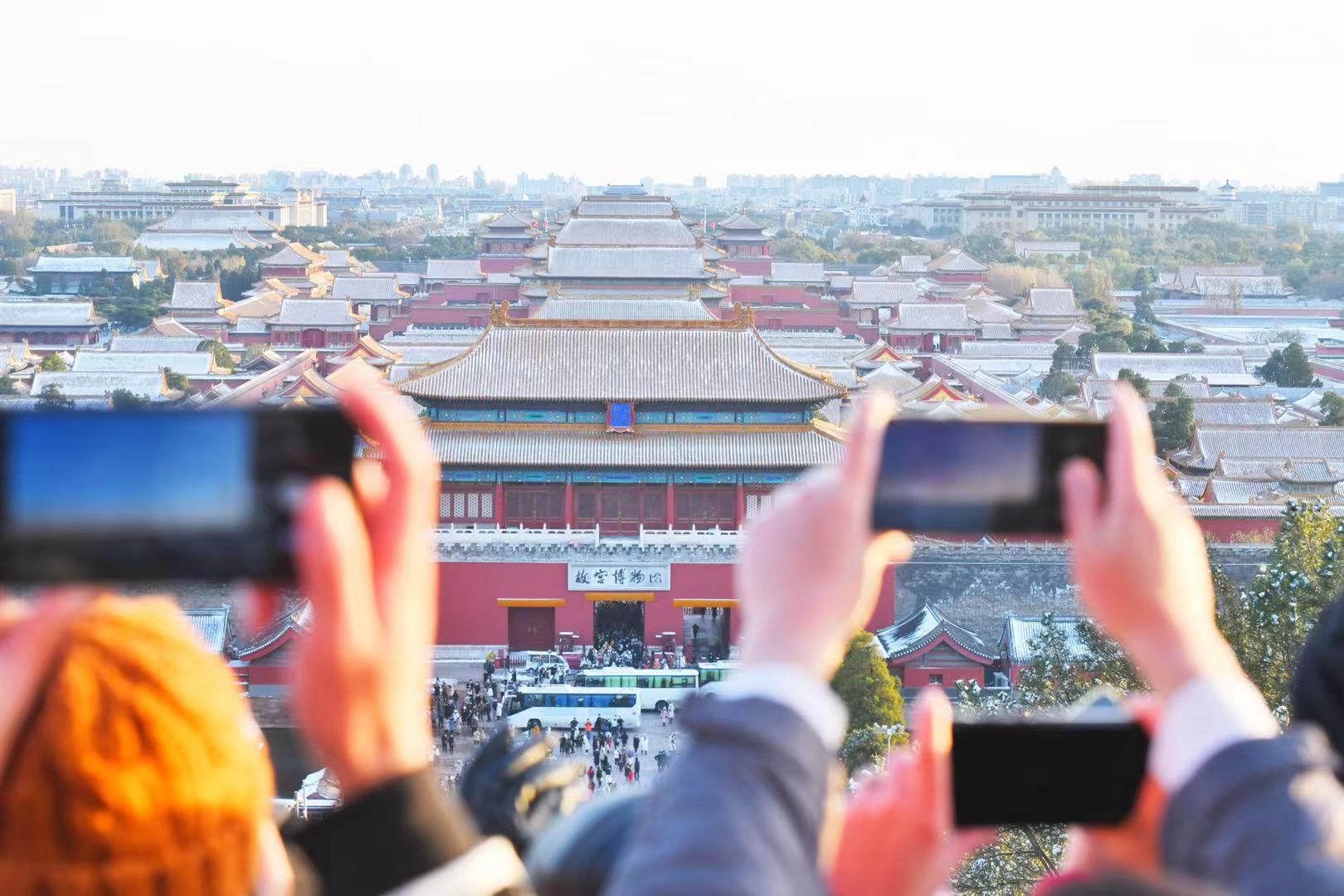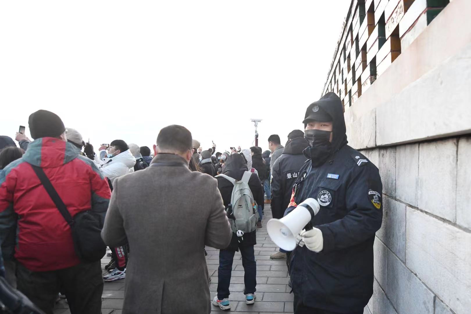 故宫的门票早已售罄,不少人选择登上景山万春亭俯瞰故宫,雪后的景山游人如织。记者从景山公园获悉,截至16时,公园接待游客34680人,园方启动山体管控,加大了万春亭区域的安保力量,保障登山游客游览安全。