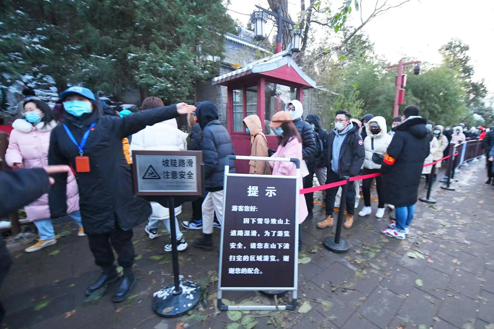 16时左右,记者在景山东门看到,排队入园的队伍长达几百米。“买不到故宫的票,只能上山看了。希望在天黑前能看到。”游客詹女士告诉记者。不仅入园要排队,上山的队伍也排起队来。“熬过了入门的人头攒动,却放弃了上山的人山人海。不过2元的门票还是不虚此行的,第一次知道景山也会有这么多的人。”和朋友来欣赏雪后美景的小彭被长队吓退,选择在山下走一走拍一拍。