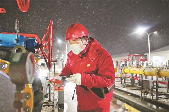 中国石油天然气销售北京分公司马驹桥门站员工冒雪巡检,确保首都百姓安全平稳用气。