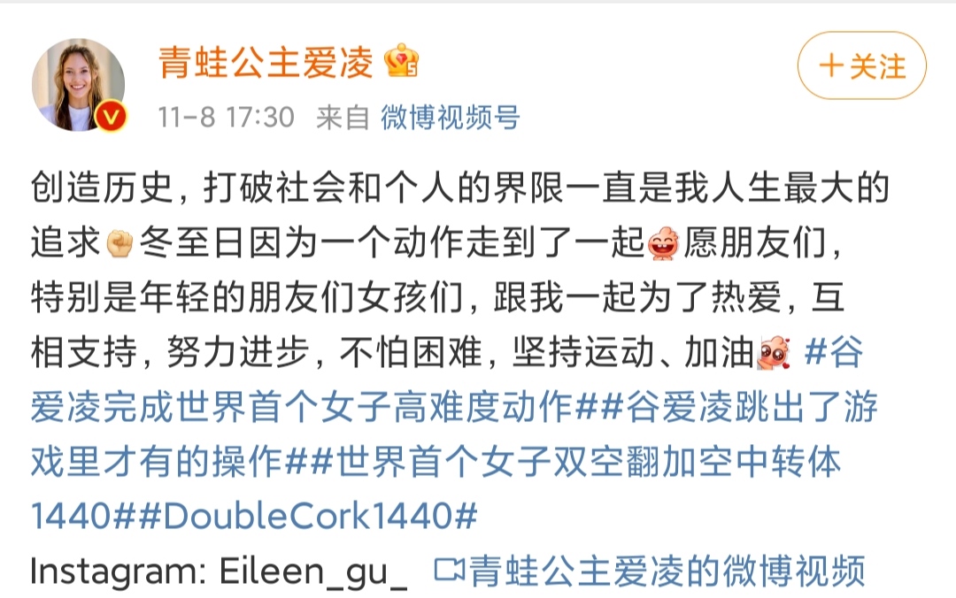 完成这一动作后,8日谷爱凌在社交媒体上这样写道:“创造历史,打破社会和个人的界限一直是我人生最大的追求。立冬日因为这个动作和大家走到了一起,愿朋友们,特别是年轻的朋友们、女孩们,跟我一起为了热爱,互相支持,努力进步,不怕困难,坚持运动,加油!”