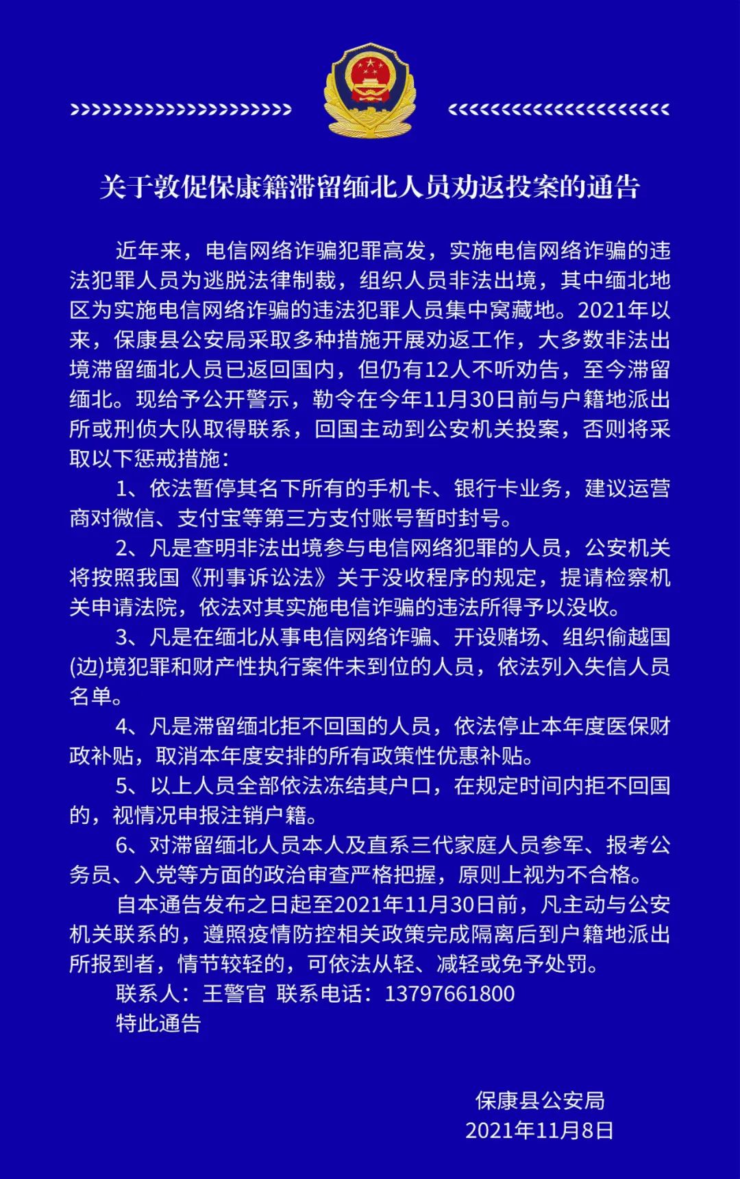 11月8日,保康县公安局对外发布通告,敦促12名保康籍滞留缅北人员,本月底前与户籍地派出所取得联系,回国主动到公安机关投案,争取宽大处理。