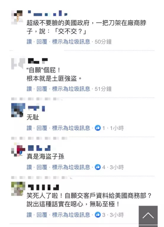 美商务部这个说法,在岛内自然引起许多网民的反感,有人怒骂美方“根本就是土匪强盗”,“超级不要脸”;还有人批评说“说出这种话实在恶心,无耻至极!”