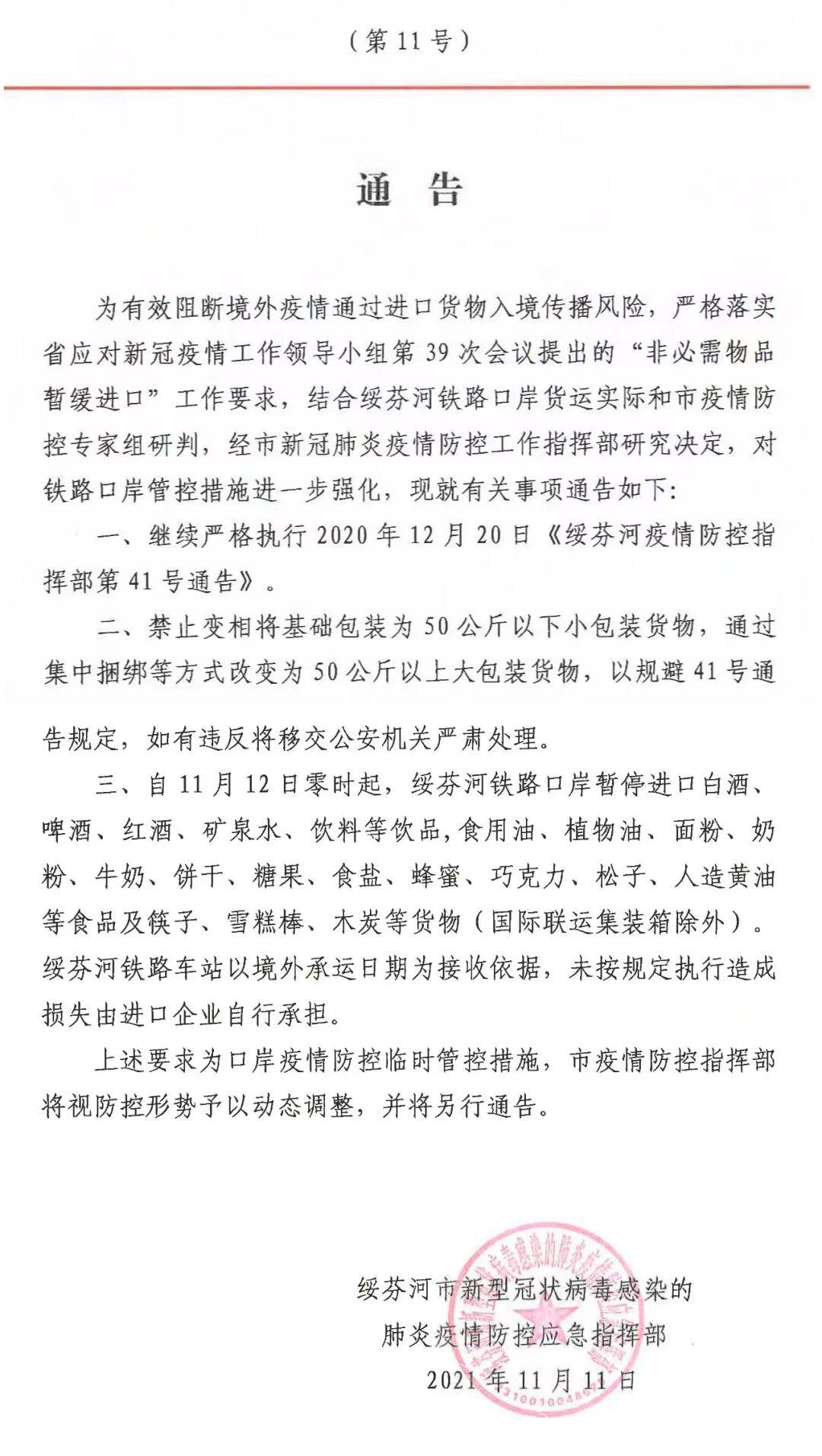 11月11日,黑龙江绥芬河疫情防控指挥部发布通告,自11月12日零时起,绥芬河铁路口岸暂停进口白酒、啤酒、红酒、矿泉水、饮料等饮品,食用油、植物油、面粉、奶粉、牛奶、饼干、糖果、食盐、蜂蜜、巧克力、松子、人造黄油等食品及筷子、雪糕棒、木炭等货物(国际联运集装箱除外)。