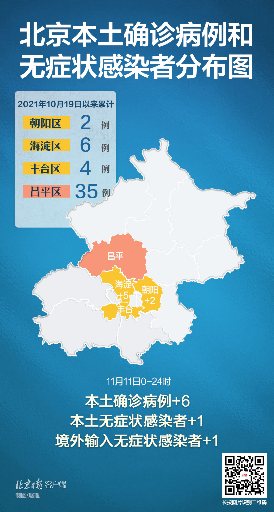 11月11日0时至24时,北京新增6例本土确诊病例和1例无症状感染者(昨日均已通报),无新增疑似病例;新增1例境外输入无症状感染者,无新增确诊病例和疑似病例。治愈出院7例。