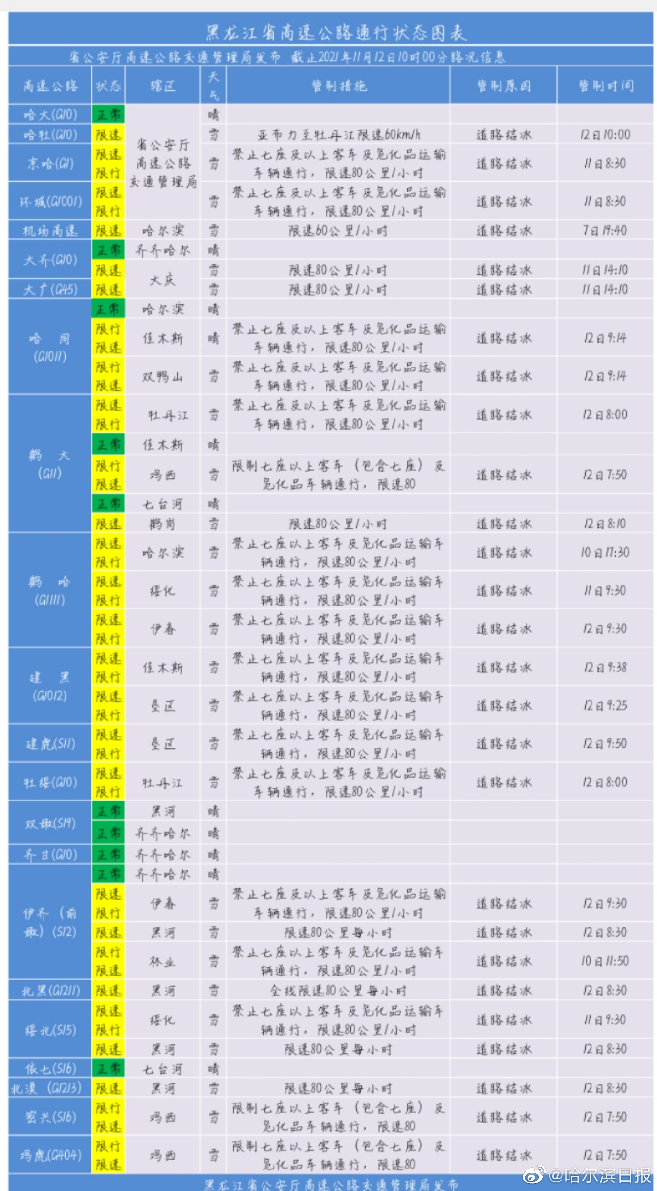12日10时15分,黑龙江省公安厅高速公路交通管理局对省内各高速公路的通行情况进行通报,目前,省内高速均已恢复通行,但哈牡、京哈、环城高速等对车速和车型进行限制。驾驶人出行前多留意高速公路的通行信息,以免耽误行程。