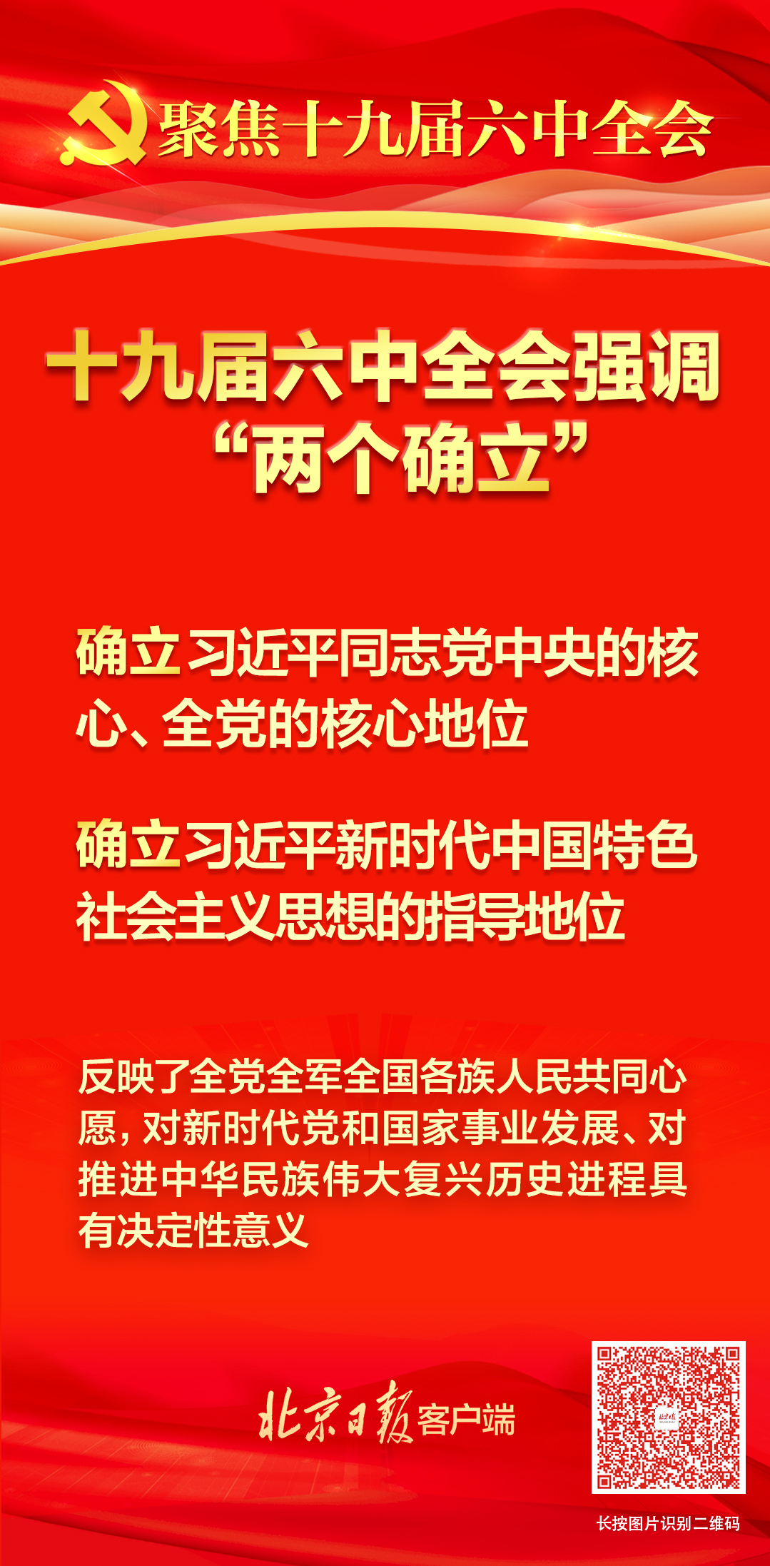 全会公报指出,党确立习近平同志党中央的核心、全党的核心地位,确立习近平新时代中国特色社会主义思想的指导地位,反映了全党全军全国各族人民共同心愿,对新时代党和国家事业发展、对推进中华民族伟大复兴历史进程具有决定性意义。中央政策研究室主任江金权表示,确立习近平同志党中央的核心、全党的核心地位,是时代呼唤、历史选择、民心所向。坚定拥护和维护习近平总书记的核心地位,全党就有定盘星,全国人民就有主心骨,中华“复兴”号巨轮就有掌舵者,面对惊涛骇浪我们就能够做到“任凭风浪起、稳坐钓鱼船”。确立习近平新时代中国特色社会主义思想的指导地位,我们党就能在中华民族伟大复兴战略全局和世界百年未有之大变局深度演进互动的复杂条件下,坚持正确前进方向,乘风破浪不迷航;就能始终把握发展规律,运用科学世界观和方法论谋划事业发展、应对风险挑战,带领全国各族人民不断开辟中华民族伟大复兴的光明前景。