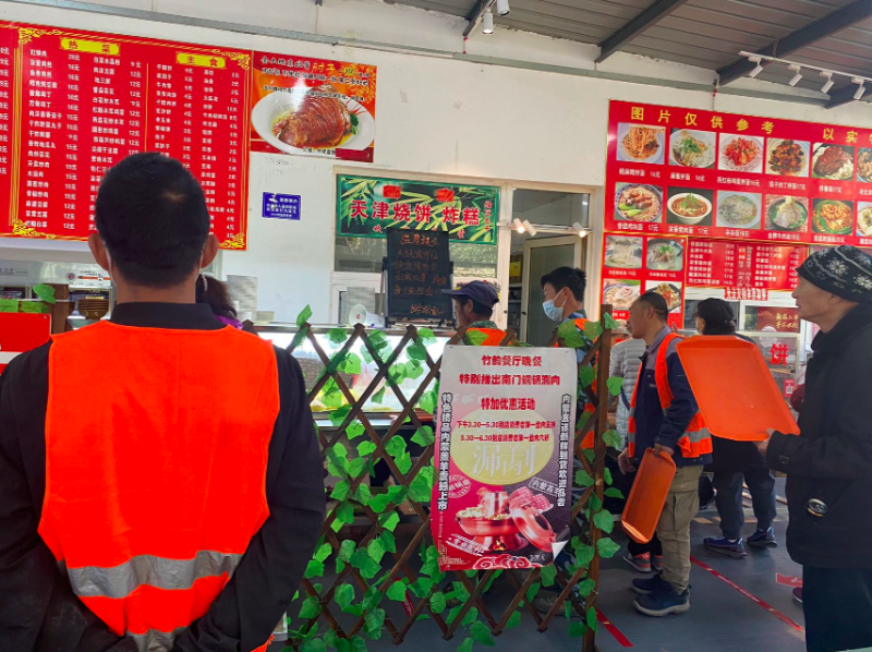 一位老大爷端着餐盘走到收银台,颤巍巍地从兜里掏出一张二十元纸币。收银员看了一眼餐盘的菜,说道:“一共16元,收20元,找您4元。”话音刚落她就迅速将找零的硬币递给老人。除了准备零钱便于老年人现金支付之外,店员还会耐心地教一些老人如何扫健康码。