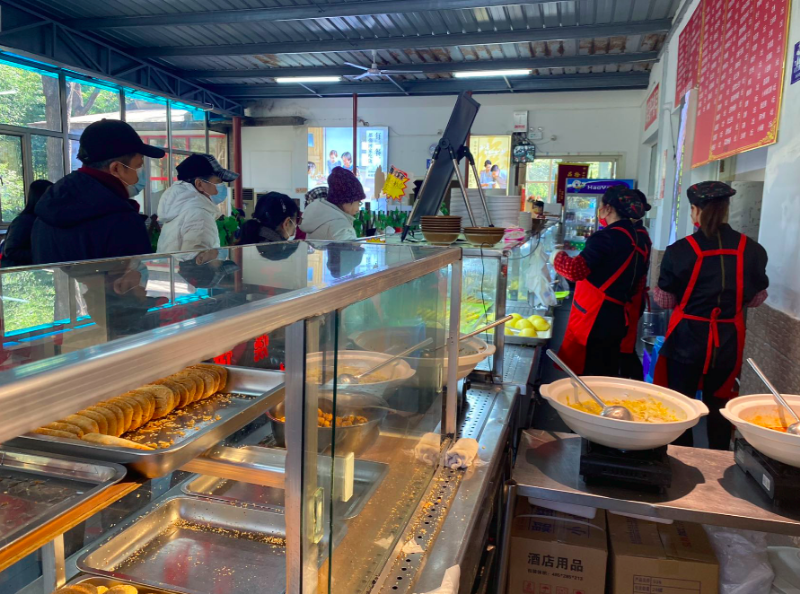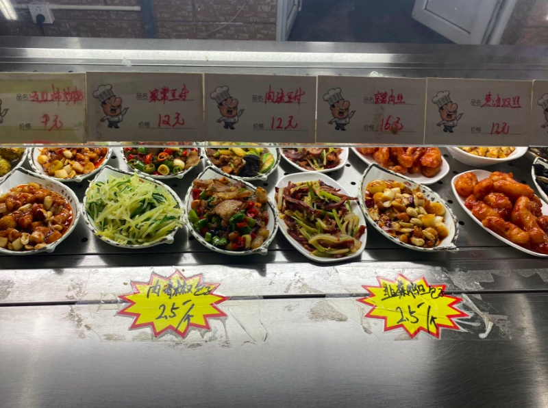 在竹韵餐厅的取餐窗口里,一份份朴素的家常菜冒着热气,散发着诱人的香味。针对老年人的需求,这里一日三餐都有不同程度的优惠,早上八点之前每张油饼只需要一元就可以买到,午餐的特定优惠菜东北酱肘子29元就可以买一整个,晚餐的铜锅涮肉按时间段打折。
