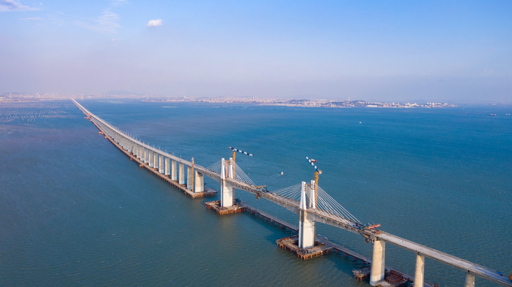 湄洲湾跨海大桥长14.7公里,海域施工长10.8公里,主桥为预应力混凝土连续刚构矮塔斜拉桥,主跨180米,跨越湄洲湾规划3000吨级航道,设南北两座双柱式主塔,桥面以上塔高30米,共有28根斜拉索,施工精度高、技术难度大,是国内首座跨海高铁矮塔斜拉桥。