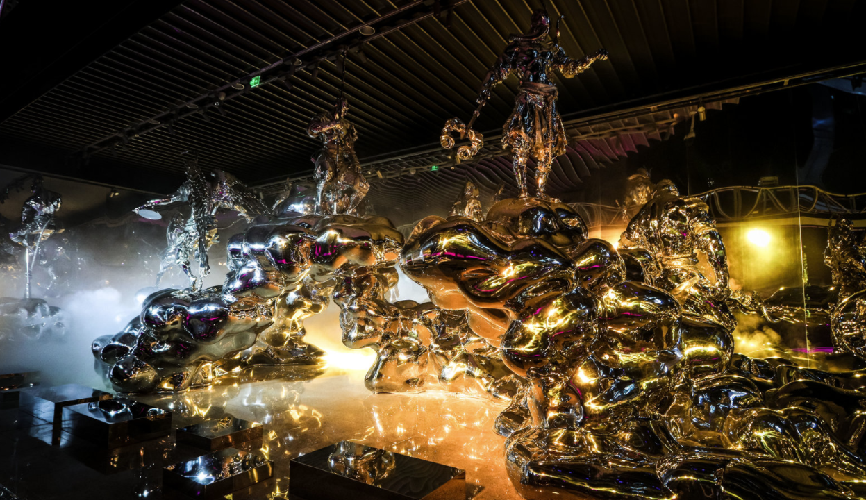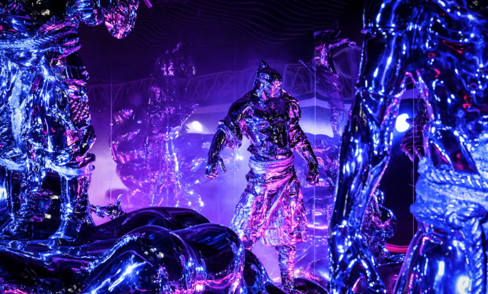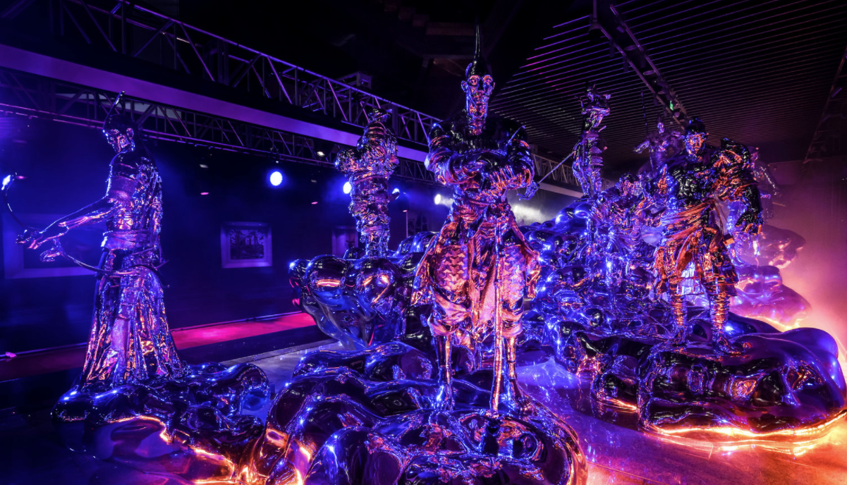 这组充满想像力的作品以3面镜面墙壁围拢12件主题群雕呈现。中国由来已久的轮值生肖和庇佑之神化身为人,屹立于干冰装置营造的“雾霭云端”之上,并巧妙植入生肖动物元素,配合由镜面营造出的空间延展,整体形成了一个无边界的虚幻世界。