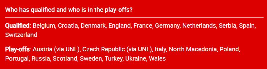 直接晋级的10支小组第一球队为:塞尔维亚队、西班牙队、瑞士队、法国队、比利时队、丹麦队、荷兰队、克罗地亚队、英格兰队、德国队。
