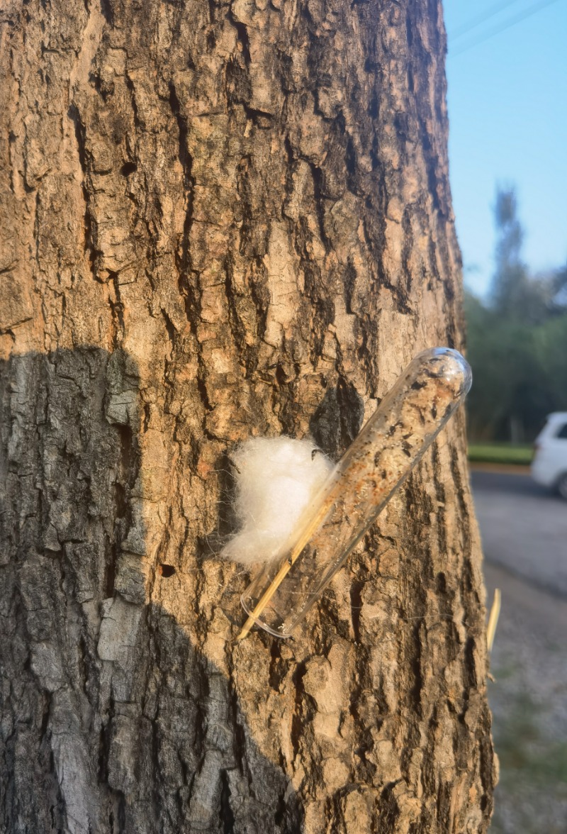 “美国白蛾的幼虫虽然要比周氏啮小蜂大几十倍,但面对天敌,它也只能束手待毙。”胡阳说。“以虫治虫”就是利用周氏啮小蜂的寄生特点,培育出来的周氏啮小蜂会被悬挂在树干2米处,投放1至2天后自然羽化飞出寻找害虫。每个柞蚕蛹里可繁育5000只左右的周氏啮小蜂,它们成虫体长仅1毫米左右,无蜂针,不攻击人,由专门实验室进行人工培育。“目前看到的蚕茧基本已经完成使命,曾经在此孕育的大部分周氏啮小蜂在发育成熟后已经飞走了,继续放在这里是希望起到宣传作用,让更多人了解生物防治。”胡阳说。