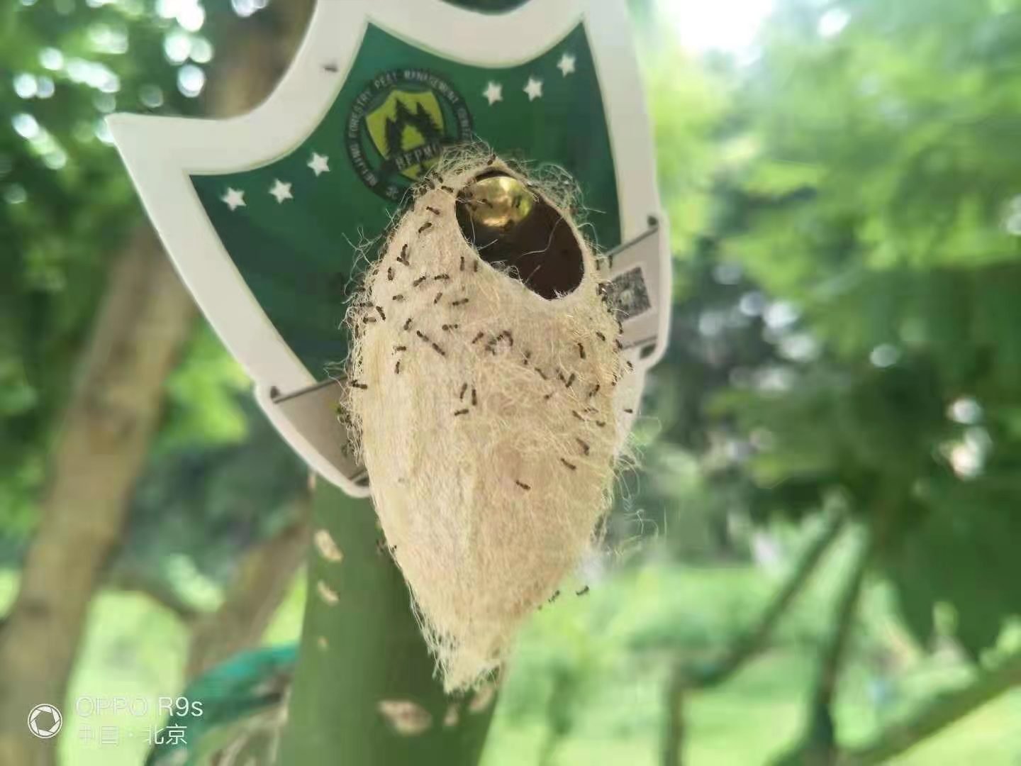 在绿心公园,杨、槐、白蜡树干2米高处,常常能看到一个褐色椭圆外壳、成人拇指大小、表面包着茧的小装置。“乍一看像蚕茧,其实是投放的周氏啮小蜂的柞蚕蛹,里面装着至少5000头周氏啮小蜂。”通州林保站副站长胡阳为记者仔细介绍。