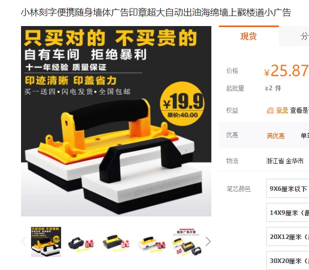 另一家店铺提供的印章大小不一,记者询问,如果印两排字,上排是疏通管道,下排是手机号码,大约需要多大的印章,客服给出的回复是“12乘8厘米”。除了大小可选,这家店还售卖“蘸油款”和“自动出油款”两种不同的印章。客服介绍,蘸油款蘸一次油只能印三次,之后就要再次用印台蘸油,所以随身要携带印台。自动出油款则是把印油加到印章里,加一次油可以印几十到上百次,无需配合印台使用。但从使用难度上说,自动出油款的要求很高,力大流淌,力小不显,推荐未使用过的新手购买蘸油款。至于印出来的效果,客服称,只有在大太阳暴晒之下才会有点掉色,印在楼道墙上是不会掉色的。