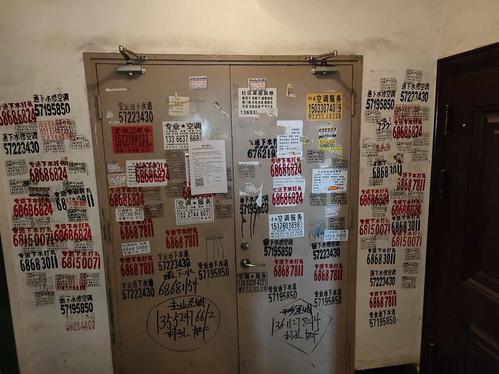 孟爷爷所在的楼层,总共只有两户人家。除了两家人的户门比较干净,旁边的楼道墙和楼道中间的电表箱大门上,全都是各种各样的小广告。尤其是电表箱大门,几乎每一块面积都会被小广告“利用”上,有的广告甚至一层盖一层。