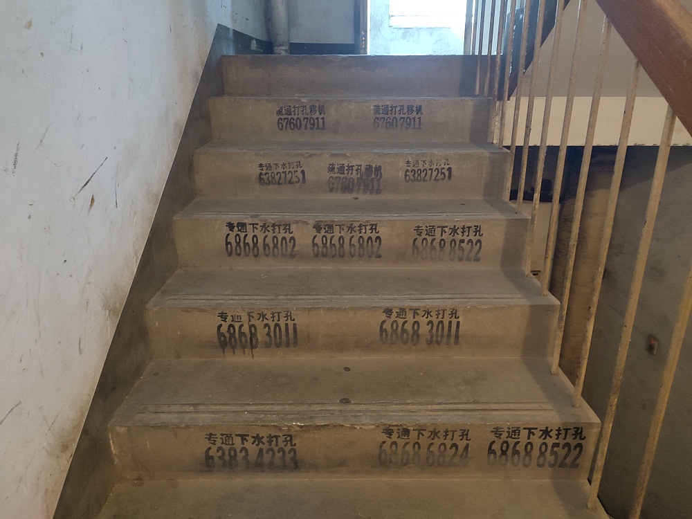 不只是每层楼的户门附近,在电梯旁边,甚至是楼梯台阶侧面,也都印着或贴着小广告。爬楼的人,低头时正好能看见广告和电话。整栋楼里,唯一较为干净的公共区域,是不同单元间的走廊过道。这里因为很少有人经过,印小广告的人往往不会在此费力。