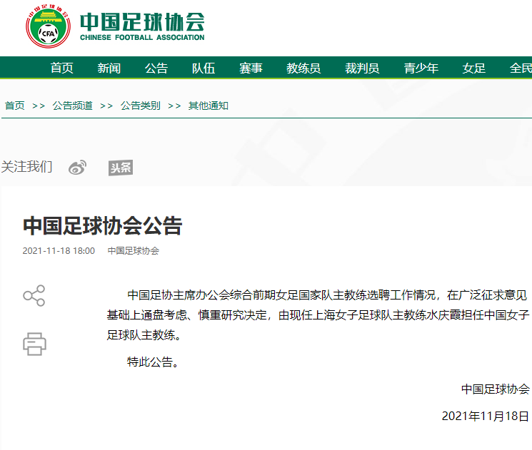 中国足协在这份十分简短的公告中写道:“中国足协主席办公会综合前期女足国家队主教练选聘工作情况,在广泛征求意见基础上通盘考虑、慎重研究决定,由现任上海女子足球队主教练水庆霞担任中国女子足球队主教练。”