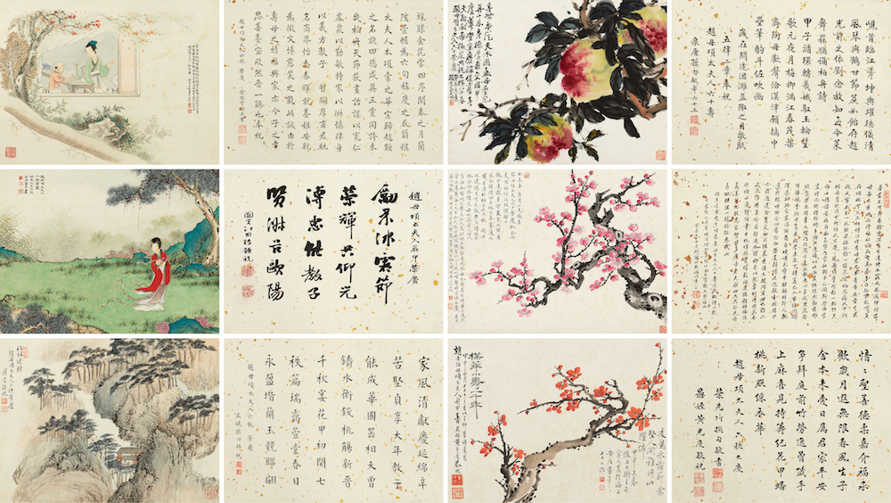 据介绍,《贞松永茂》集结了齐白石、黄宾虹、吴湖帆、溥心畬等当时多位艺术大师的书画作品,分装成“福”“禄”“寿”“禧”四册,引首由当时的文坛领袖叶恭绰题“贞松永茂”四字。艺术收藏史研究学者孙炜表示,这是一部为母亲祝寿之用的书画合璧册页,也是迄今为止规模最大、内容浩繁的民国书画册页。它为近现代中国画史留下了一份弥足珍贵的资料,堪称“一部为母贺寿册,一部民国书画史”。