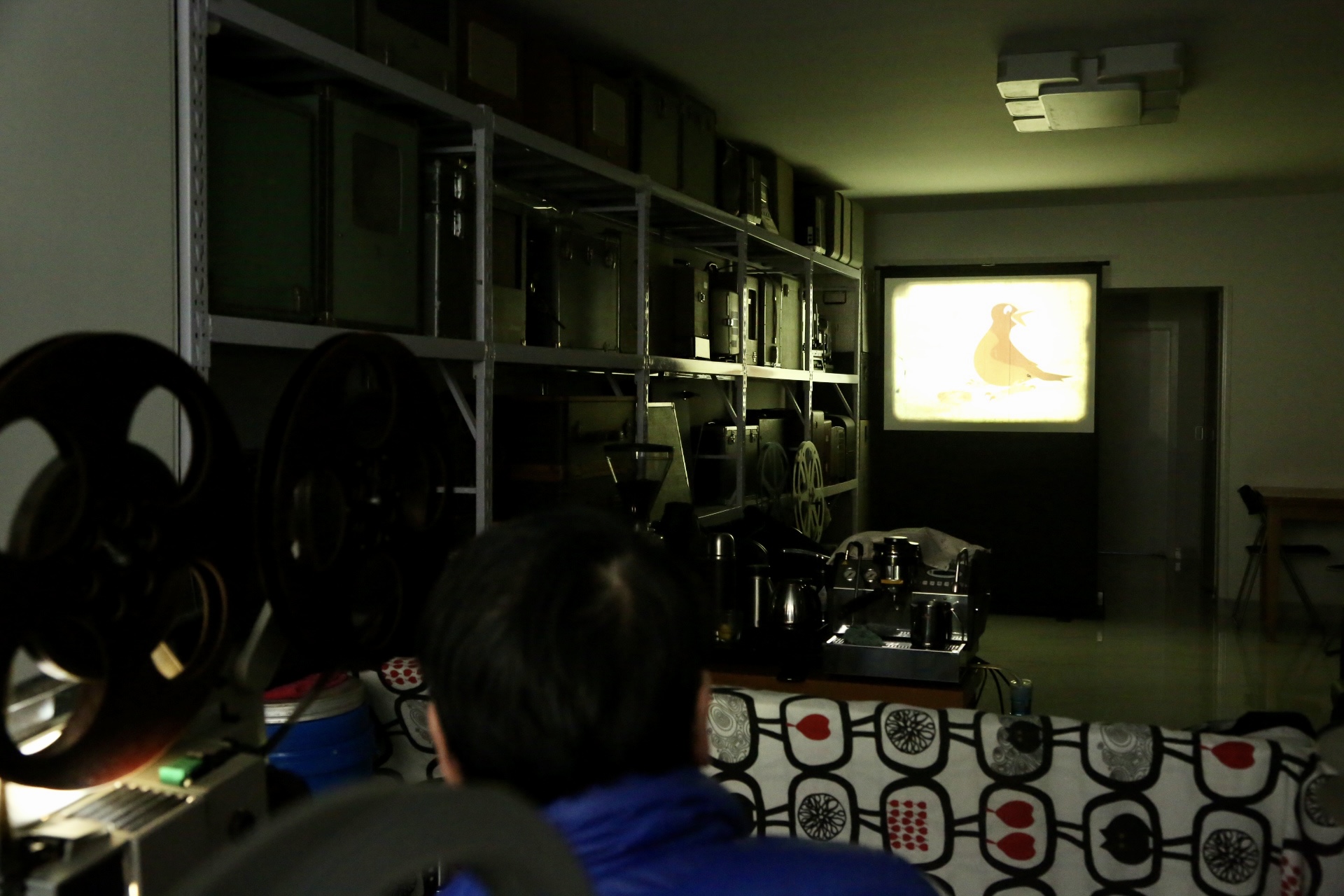 李树超的家位于丰台区一栋居民楼的一层,一进门,就看到了摆在客厅里的满架的胶片放映机,正对北面房间的墙上挂着一个小银幕。靠南的阳台上,十多台大型的胶片放映机挤得满满当当。