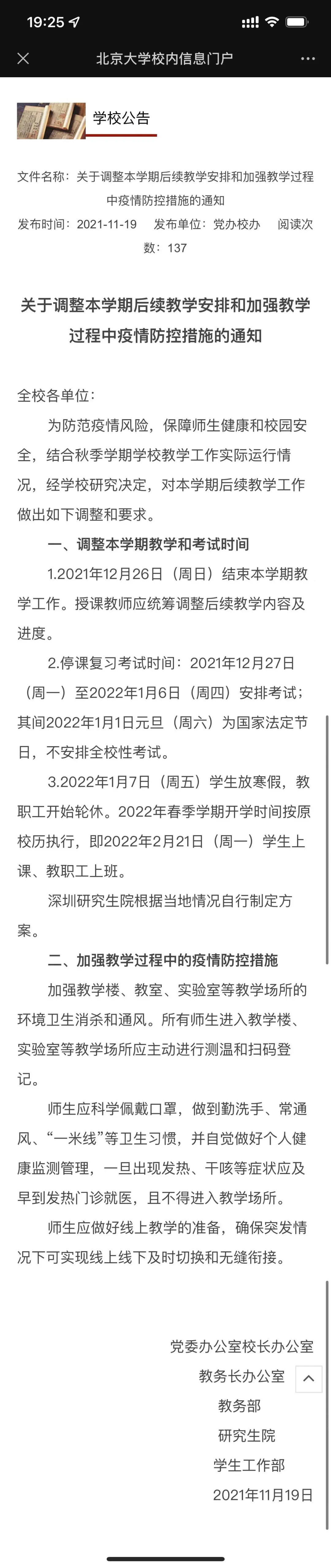 11月19日,北京大学发布《关于调整本学期后续教学安排和加强教学过程中疫情防控措施的通知》,明确2022年1月7日(周五)学生放寒假,而此前校历显示,校本部、医学部寒假自1月17日开始,意味着北大比原计划提前10天放寒假。