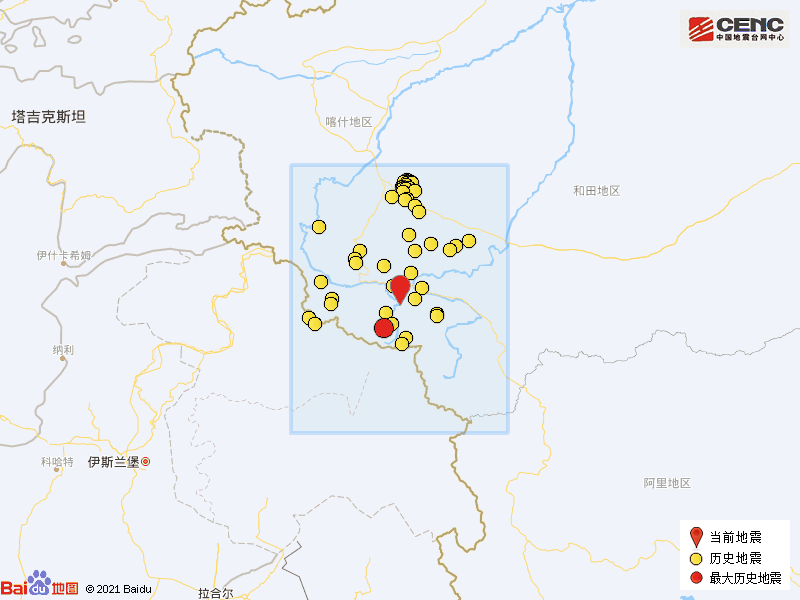 历史地震:根据中国地震台网速报目录,震中周边200公里内近5年来发生3级以上地震共104次,最大地震是2017年12月7日在新疆喀什地区叶城县发生的5.2级地震(距离本次震中61公里),按震级大小前50次历史地震分布如图。