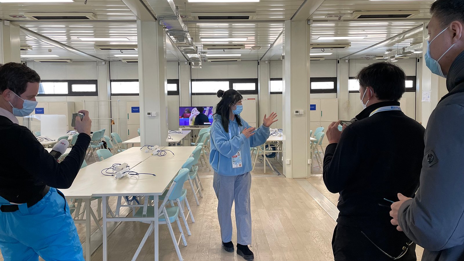 雪上项目比赛在室外进行,低温、大风等天气状况都会成为媒体工作的障碍。赛时,媒体工作间在记者们眼中就是“温暖的家”。所以,参与本次测试赛报道工作的记者们抵达云顶场馆群后,最关心的就是场馆媒体中心的情况。云顶滑雪公园新闻运行经理杨中团第一时间向记者介绍了场馆媒体中心。