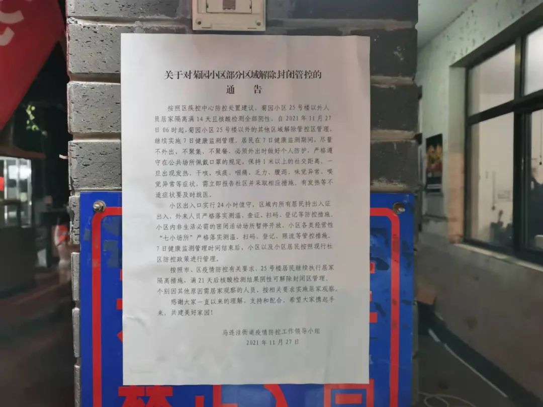 11月12日,北京市海淀区接报,马连洼街道菊园小区1人核酸检测结果为阳性,开始封控。今天,按照区疾控中心防控处置建议,菊园小区25号楼以外人员居家隔离满14天且核酸检测全部阴性,自2021年11月27日6时起,菊园小区25号楼以外的其他区域解除管控区管理,继续实施7日健康监测管理。