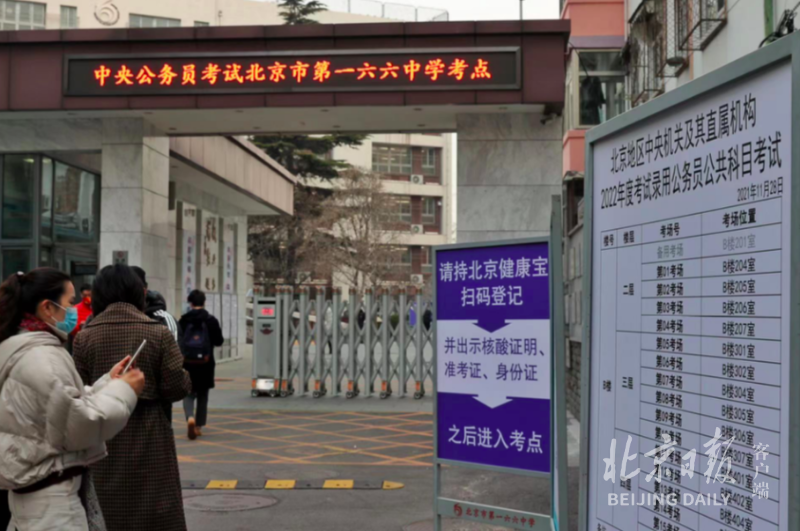 早上8点刚过,北京一六六中学的考点已有考生陆续到场。学校门口竖立着一个显眼的宣传牌,提示考生扫码登记、出示核酸证明、准考证、身份证。工作人员也不停地提示考生做好防疫措施。考生们都自觉按照要求,戴着口罩,拿出手机,扫描旁边的北京健康宝二维码,然后向工作人员展示“未见异常”界面,并出示自己的身份证以及核酸检测报告。现场秩序井然。