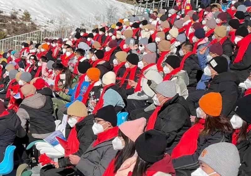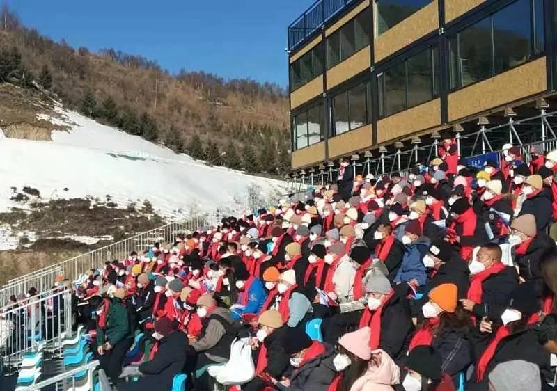 11月27日13点,2021/2022国际雪联单板滑雪和自由式滑雪障碍追逐世界杯自由式滑雪男、女障碍追逐赛决赛在云顶滑雪公园开赛。这是一场容许观众入场的测试赛。比赛开始前,看台上的观众掀起了热烈的气氛。