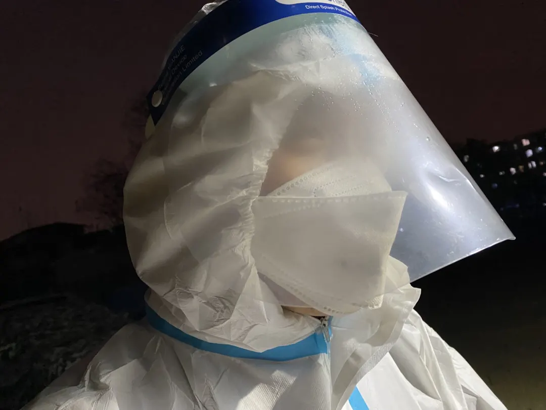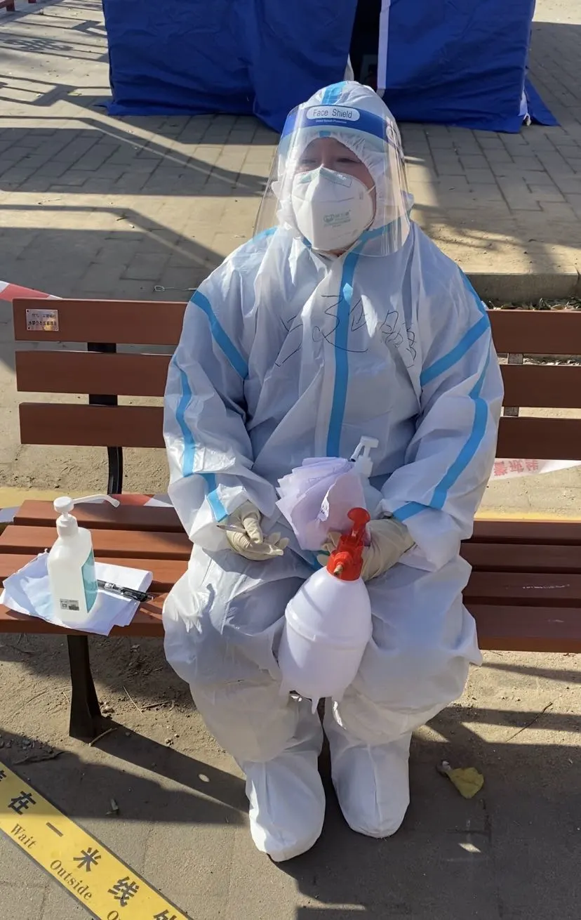 ▲菊园小区社区居干吕延鹏入户核酸检测完坐在椅子上说:“我得歇会儿!”