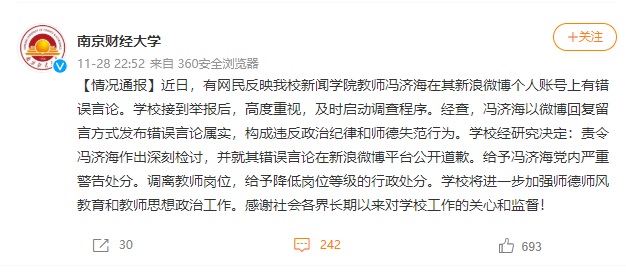 南京财经大学11月28日晚发布情况通报,公布对新闻学院教师冯济海的调查处理结果。通报全文如下: