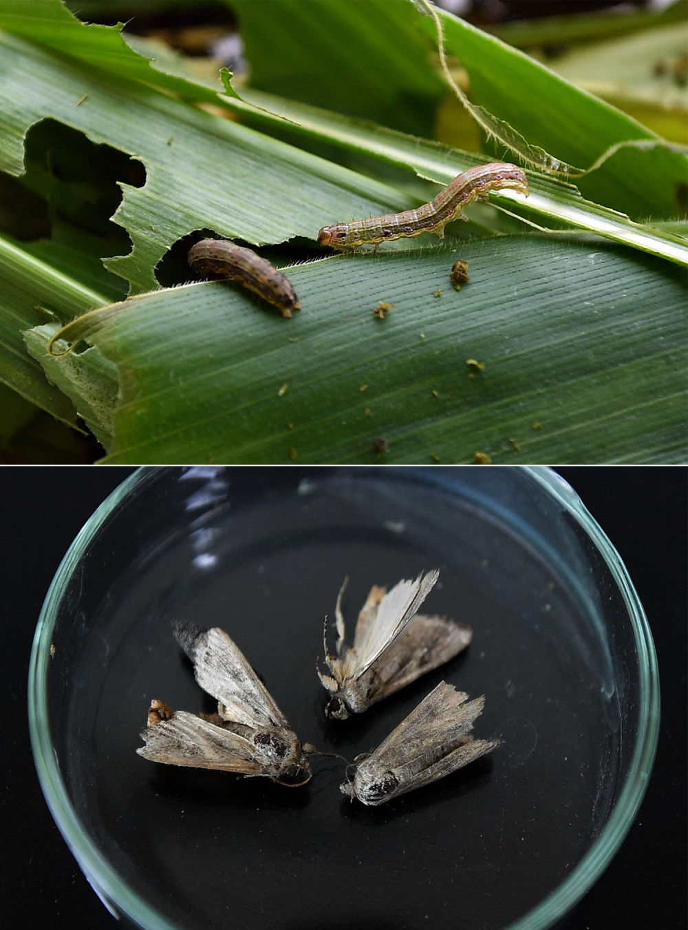 这是草地贪夜蛾幼虫(上)和成虫。新华社记者郭程 摄