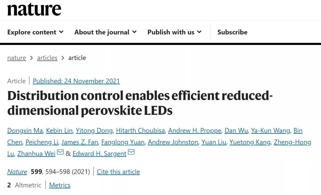 2021年11月25日,Nature在线发表了加拿大多伦多大学电子与计算机工程系Edward H. Sargent团队和华侨大学发光材料与信息显示研究院、材料科学与工程学院魏展画团队合作完成的研究论文,题为《Distribution control enables efficient reduced-dimensional perovskite LEDs》。