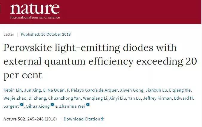 2018年10月11日,国际顶级学术刊物Nature在线发表华侨大学材料科学与工程学院魏展画教授为第一通讯作者、博士生林克斌为第一作者,华侨大学为第一完成单位的研究论文 Perovskite Light-Emitting Diodes with External Quantum Efficiency Exceeding 20 percent ,报道了钙钛矿电致发光领域的重大研究进展:他们制备出了全球领先的高亮度、高量子转换效率的绿光钙钛矿LED器件,其外量子效率达到20.3%,寿命超过 100 小时,刷新了该领域的世界纪录。