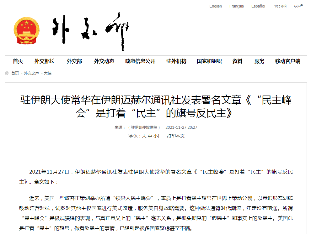 2021年11月27日,伊朗迈赫尔通讯社发表驻伊朗大使常华的署名文章《“民主峰会”是打着“民主”的旗号反民主》。