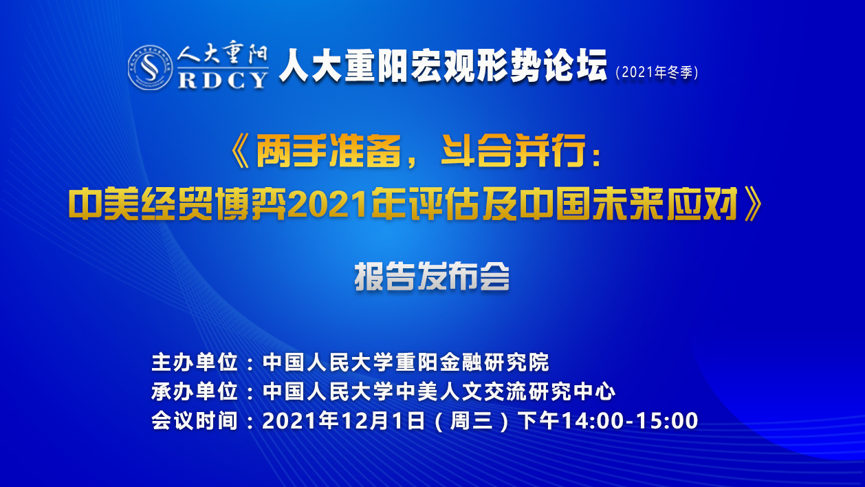 12月1日,由中国人民大学重阳金融研究院主办、中国人民大学中美人文交流研究中心承办的宏观形势论坛(2021年冬季)报告发布会成功举行。会上,中国人民大学重阳金融研究院高级研究员何伟文、研究员蔡彤娟共同发布了《两手准备,斗合并行:中美经贸博弈2021年评估及中国未来应对》报告,报告由何伟文主笔,人大重阳课题组共同完成。