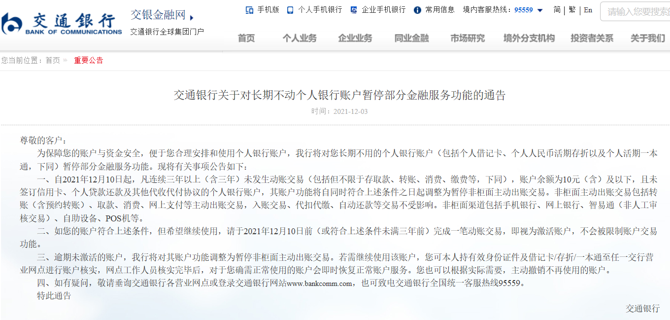 交通银行关于对长期不动个人银行账户暂停部分金融服务功能的通告
