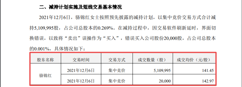 根据公告披露,12月6日,骆锦红按照预先披露的减持计划,以集中竞价交易方式合计减持5109995股,占公司总股本的0.269%。在减持过程中,因交易软件刷新延时,界面切换错误,以致将“卖出”误操作为“买入”,错误买入公司股份2万股,占公司总股本的0.001%。