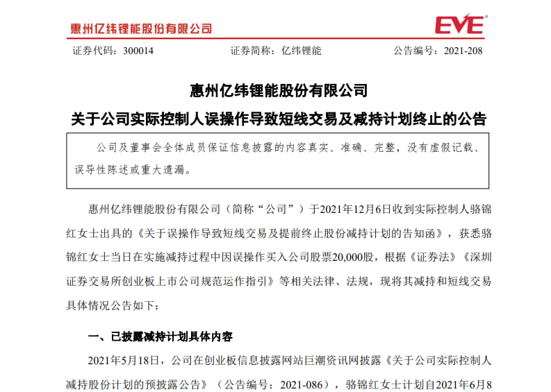 12月6日晚,惠州亿纬锂能股份有限公司(简称“亿纬锂能”)公告,公司实控人骆锦红在减持过程中因误操作,买入公司2万股股票,构成短线交易。实控人将所得收益上缴公司、致歉,并决定提前终止减持。