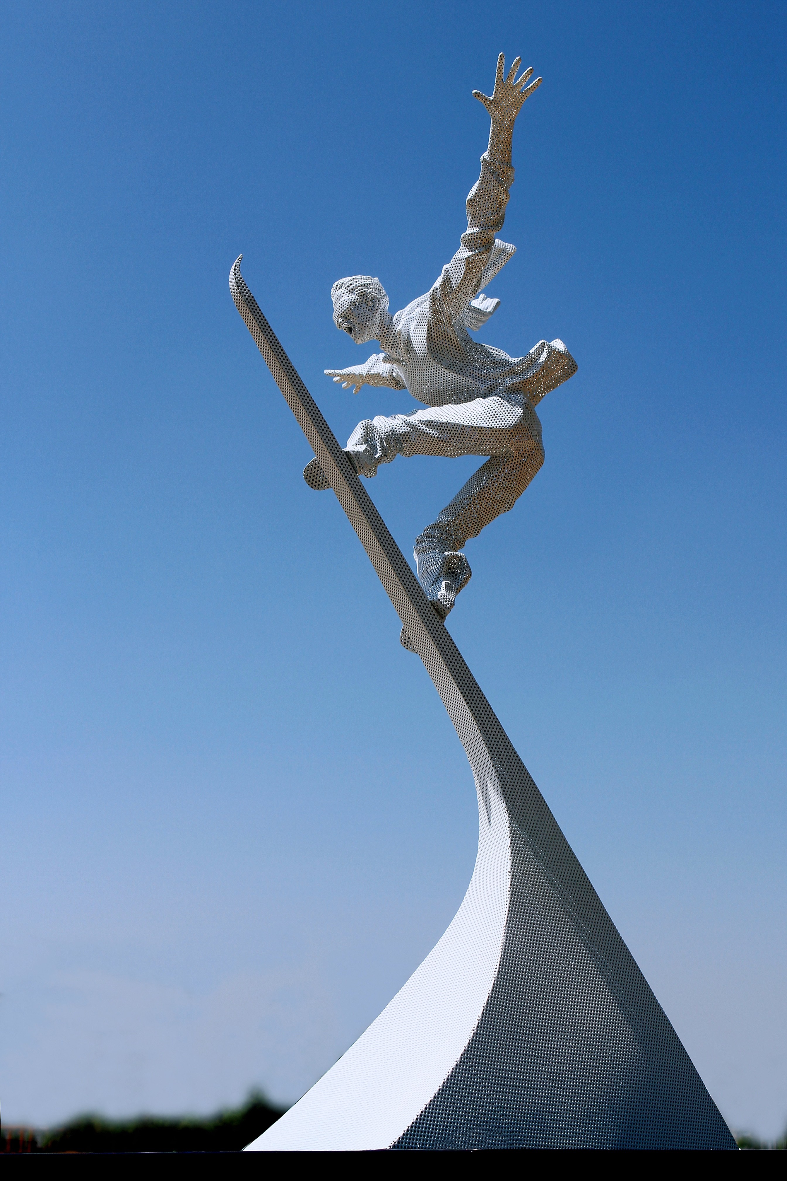 伴随着申办冬奥会的热潮,章华的雕塑《翱翔》于2014年在崇礼冰雪小镇落地。这件16米高的巨型雕塑展现着滑雪运动员展臂飞翔的英姿,不锈钢的材质巧妙映衬着周围的冰雪氛围,已经成为游客们来到崇礼的必打卡地。2015年7月31日,北京携手张家口申办2022年冬奥会成功,章华更是激动得彻夜难眠。此后,他放弃了其他题材的创作和参展机会,静下心来搜集整理冰雪运动画面资料,观看体育比赛积累素材,把艺术创作的重点全部放到了冬奥题材上。