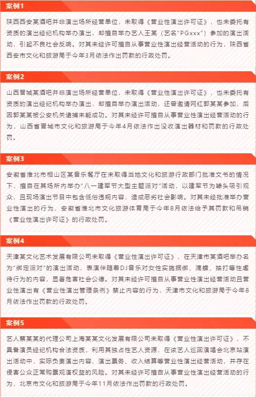 此外,陕西西安某酒吧并非演出场所经营单位,未取得《营业性演出许可证》,也未委托有资质的演出经纪机构举办演出,却擅自举办艺人王某(艺名“PGxxx”)参加的演出活动,引起不良社会反响。