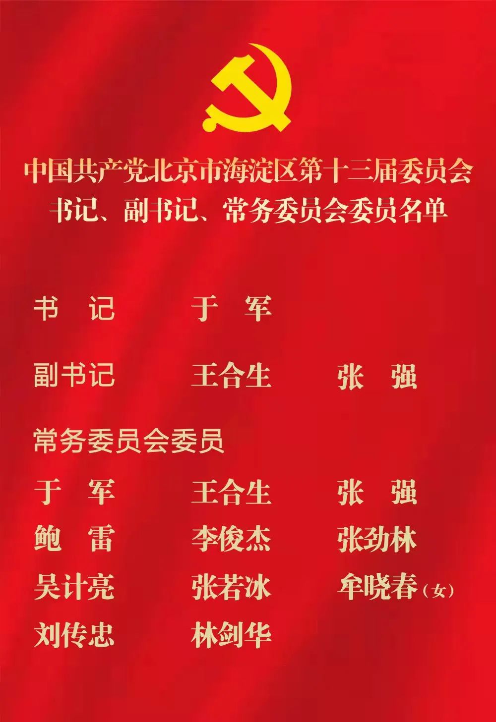 12月7日,中国共产党北京市海淀区第十三届委员会第一次全体会议召开,选举产生了中国共产党北京市海淀区第十三届委员会常务委员会委员和区委书记、副书记。