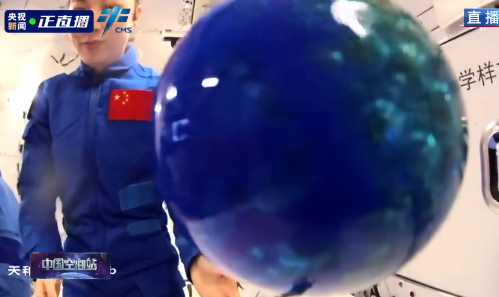 “接下来我要制作一个‘太空欢乐球’。”王亚平在向水球内注入蓝色颜料后,她取出一颗泡腾片,放进了水球内。