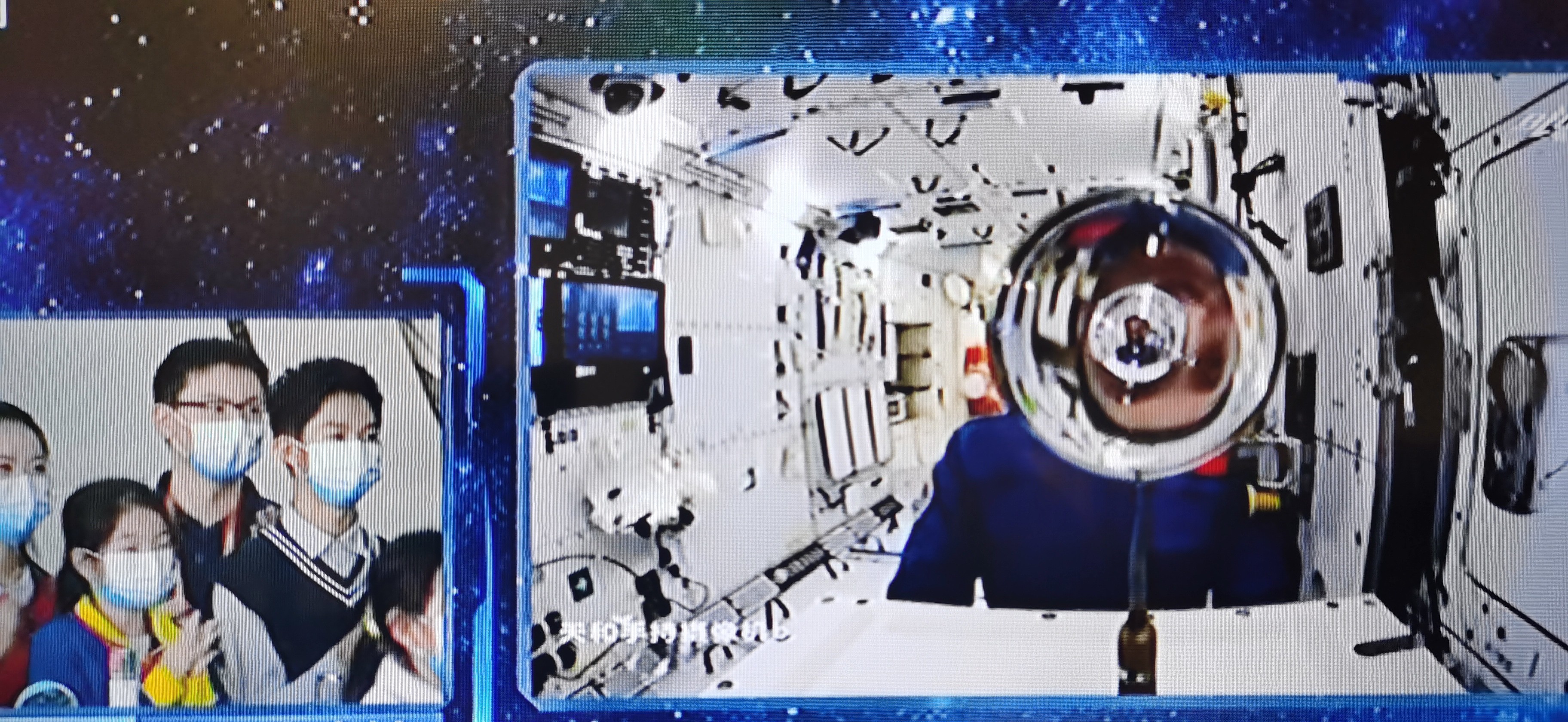 今天,地面上的孩子们和八年前一样,再一次透过太空中的水球看到了“倒立”的王老师。地面课堂的孩子们则拿起桌面上的玻璃球,体验到了同样的视觉效果。