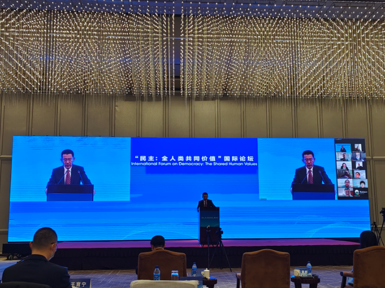 “民主:全人类共同价值”国际论坛由中共中央宣传部、国务院新闻办公室主办,中国社科院、中央广电总台、中国外文局承办。120多个国家和地区、20多个国际组织的500余名嘉宾线上线下参会。论坛将分为三个阶段进行。