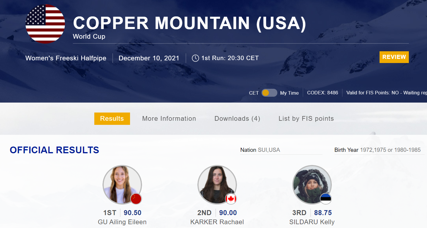 北京冬奥会开始前,国际雪联U型场地世界杯仅有3站,本站为新赛季首战。谷爱凌在本站比赛预赛阶段排名第二闯进决赛,张可欣排名预赛第8同样闯进决赛。决赛共8名选手,进行三轮比拼。