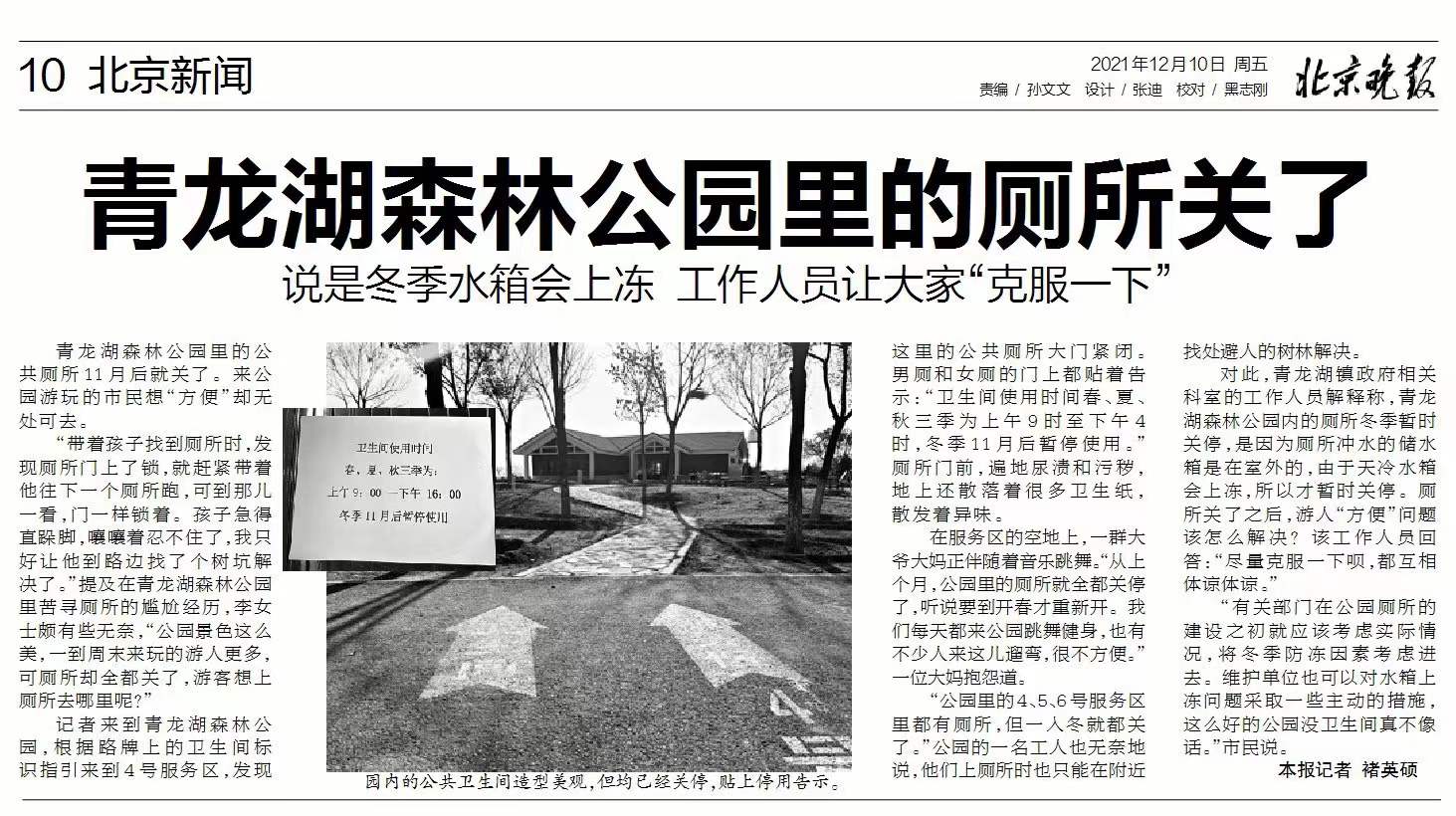 12月10日,《北京晚报》以《青龙湖森林公园里的厕所关了》为题,报道了青龙湖森林公园里的公共厕所11月后就关了,来公园游玩的市民想“方便”却无处可去。青龙湖镇政府接诉即办,采取一系列应急措施,重开了公园内的厕所,供游人“方便”。
