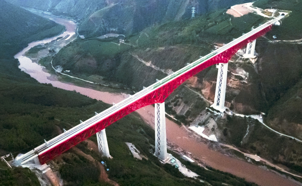 ↑2021年12月3日,中老铁路首发列车驶过云南省境内的元江双线特大桥。