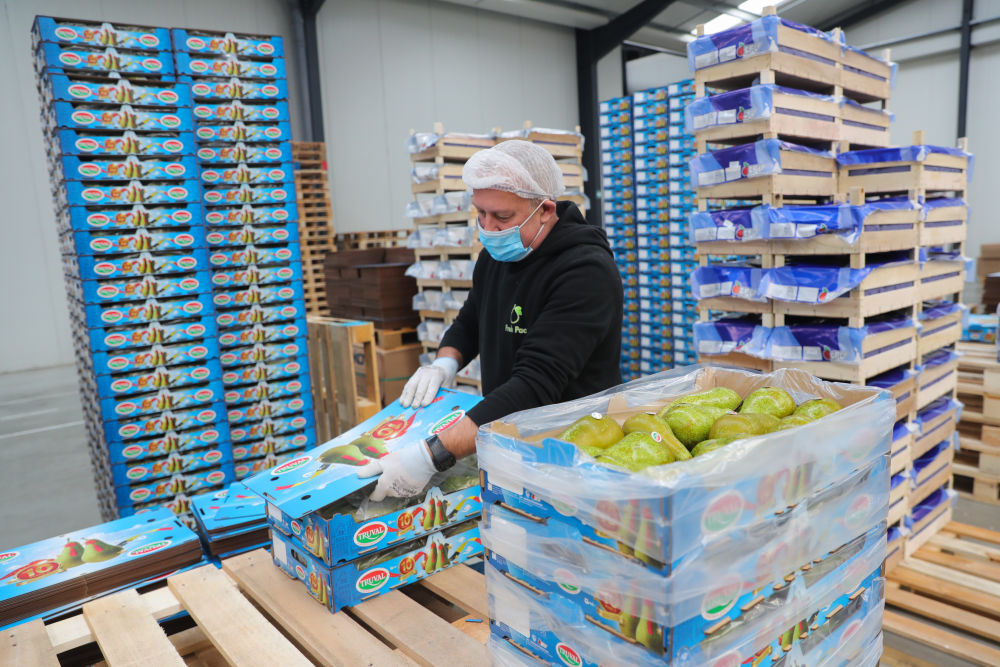 ↑2021年10月22日,在比利时圣希利斯-瓦斯市的一个水果分拣包装车间,工作人员把即将出口到中国的比利时啤梨装箱。